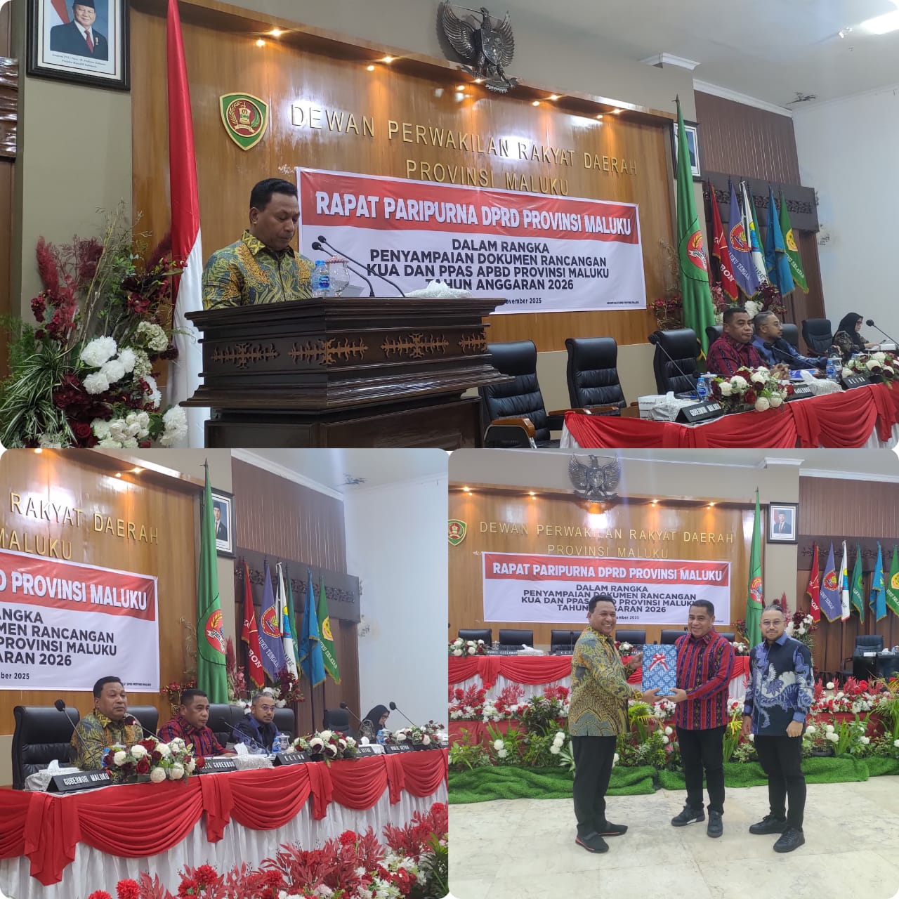 Wakil Gubernur Maluku, H. Abdullah Vanath, secara resmi menyampaikan Rancangan Kebijakan Umum Anggaran serta Prioritas dan Plafon Anggaran Sementara (KUA-PPAS) Tahun Anggaran 2026 dalam Rapat Paripurna DPRD Provinsi Maluku yang digelar di ruang sidang utama, Sabtu (15/11/2025).
